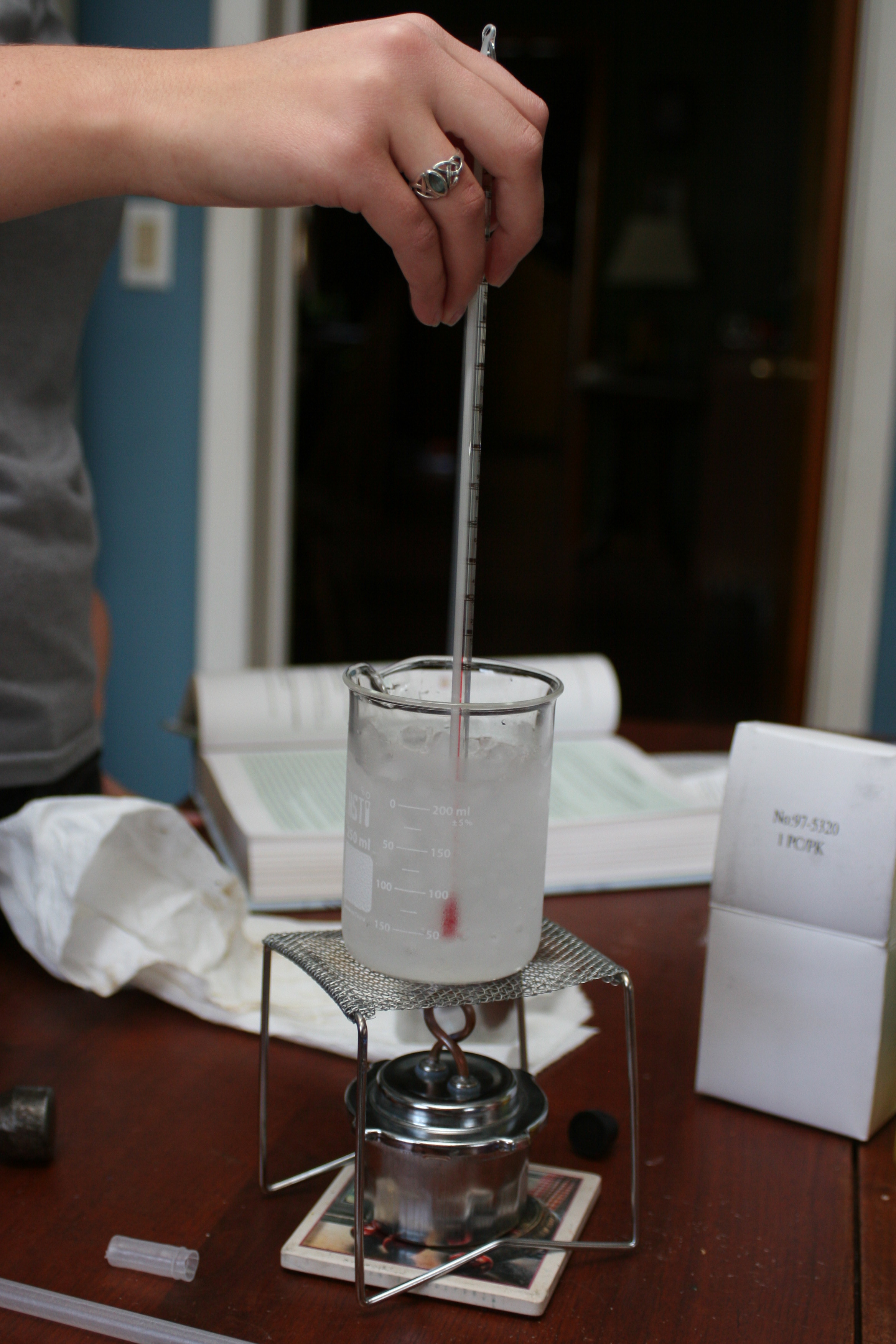 yesterday, Reasa did science experiments. she smashed ice with a hammer, and calibrated a thermometer with her denatured alcohol burner. it was like…school.